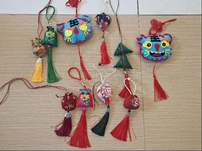 不一会儿,一个个造型独特、兼具观赏性、趣味性的香囊就完成了。大家用彩绳把一个个香囊串起来,香囊清幽的香气弥漫开来,为端午佳节增添了一份浓浓的喜气。